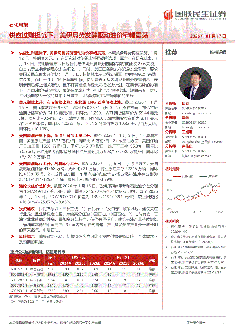 石化行业:国联民生证券-石化行业周报:供应过剩担忧下,美伊局势发酵驱动油价窄幅震荡-260117