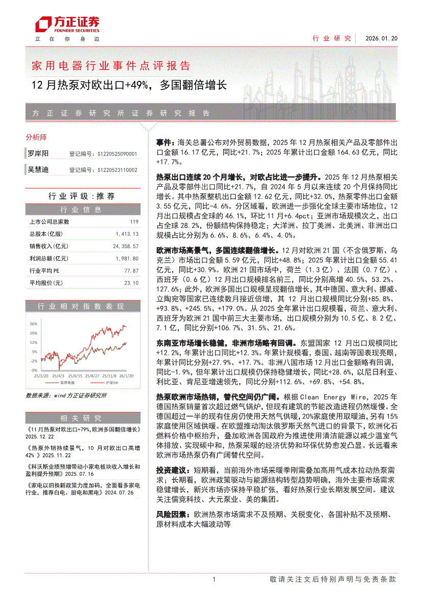 家用电器行业:方正证券-家用电器行业事件点评报告:12月热泵对欧出口+49%,多国翻倍增长-260120