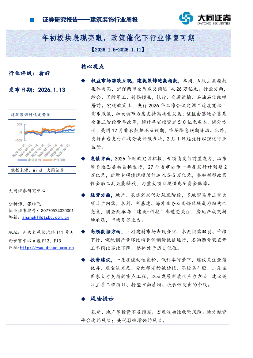大同证券-建筑装饰行业周报:专项债发行放量,建筑装饰跑赢指数-260127