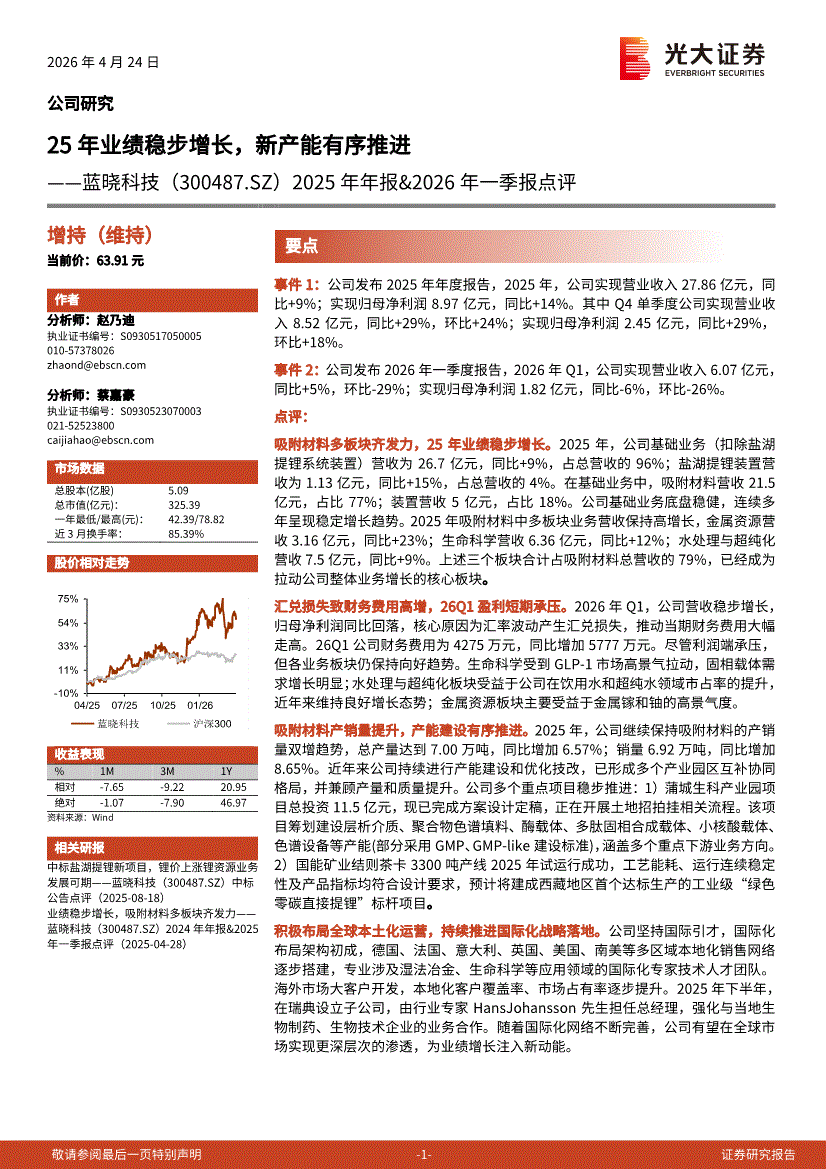 蓝晓科技:光大证券-蓝晓科技-300487-2025年年报&2026年一季报点评:25年业绩稳步增长,新产能有序推进-260424