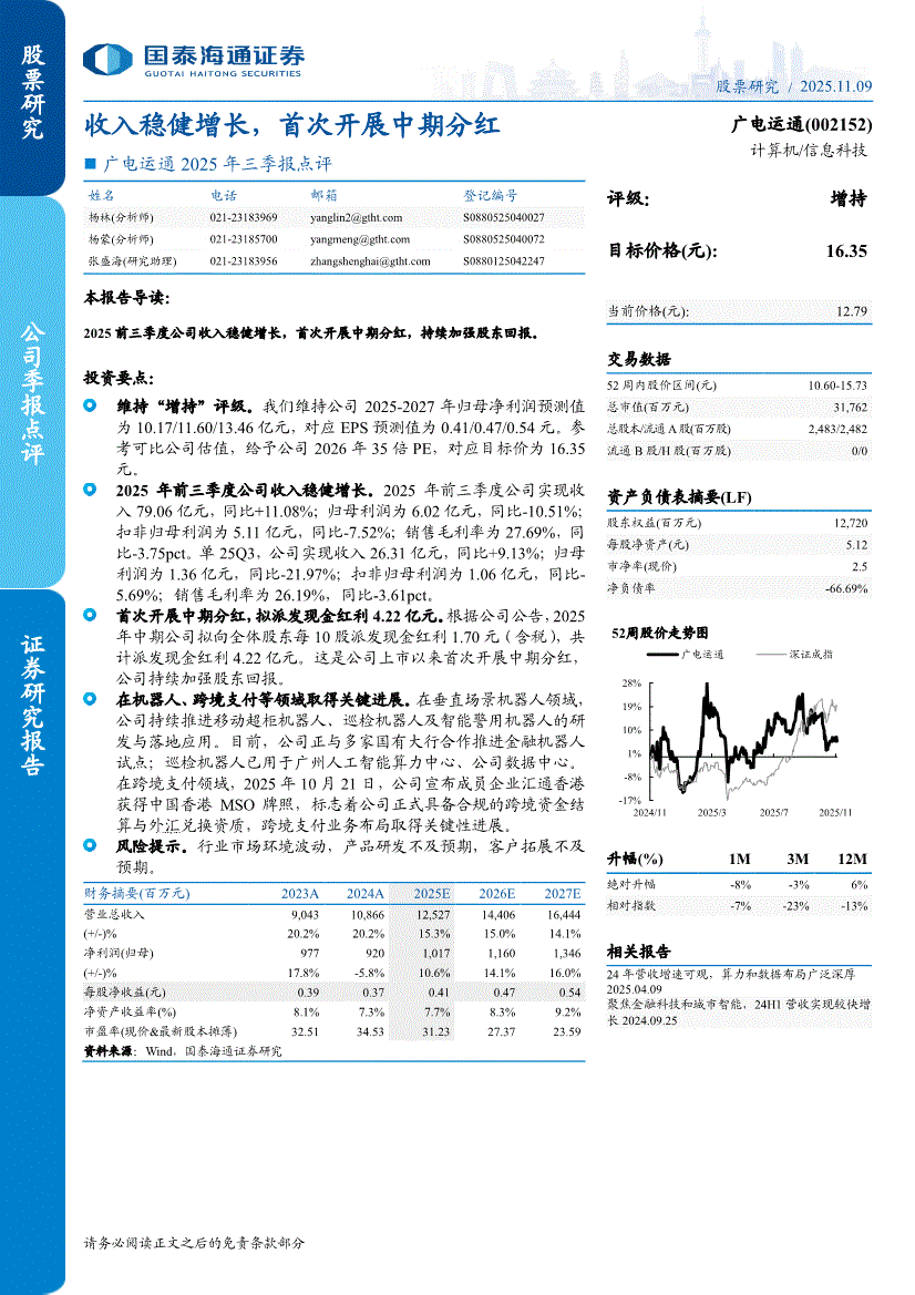 广电运通:国泰海通证券-广电运通-002152-2025年三季报点评:收入稳健增长,首次开展中期分红-251109