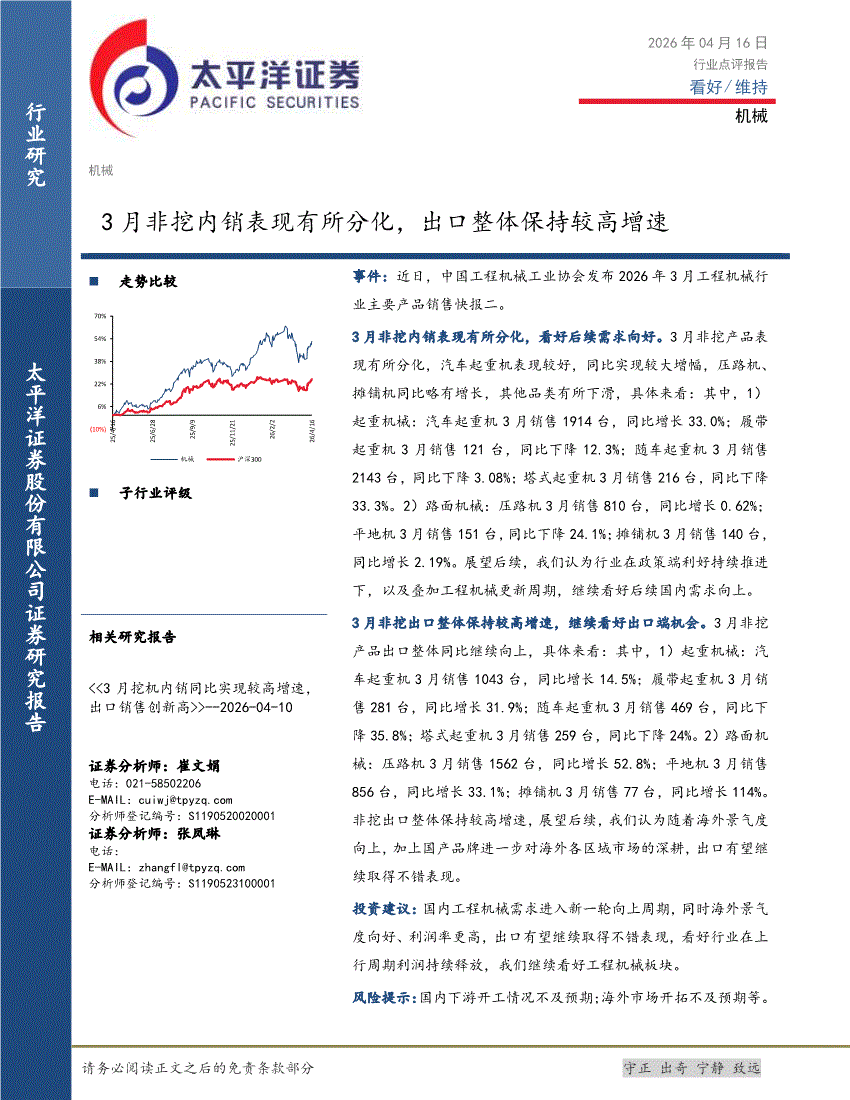 机械行业:太平洋证券-机械行业:3月非挖内销表现有所分化,出口整体保持较高增速-260416