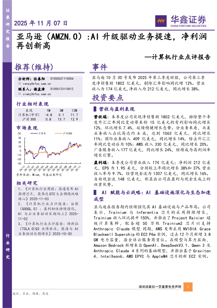 计算机行业:华鑫证券-计算机行业点评报告:亚马逊(AMZN.O),AI升级驱动业务提速,净利润再创新高-251107