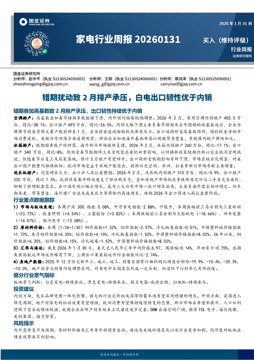 家电行业:国金证券-家电行业周报:错期扰动致2月排产承压,白电出口韧性优于内销-260131