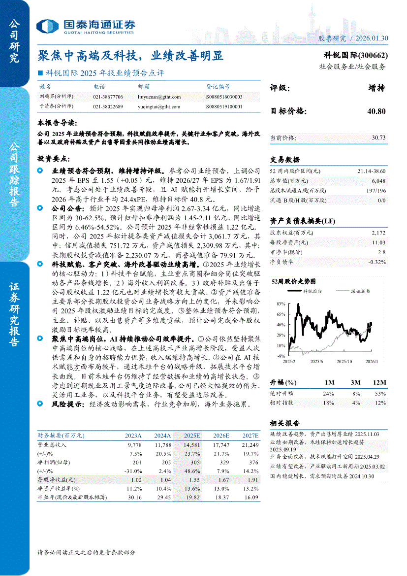 科锐国际:国泰海通证券-科锐国际-300662-2025年报业绩预告点评:聚焦中高端及科技,业绩改善明显-260130