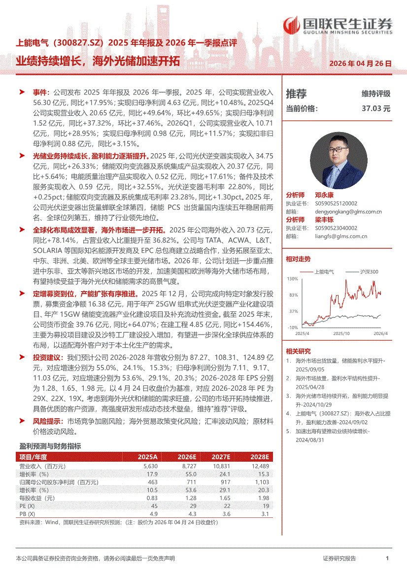 上能电气:国联民生证券-上能电气-300827-2025年年报及2026年一季报点评:业绩持续增长,海外光储加速开拓-260426