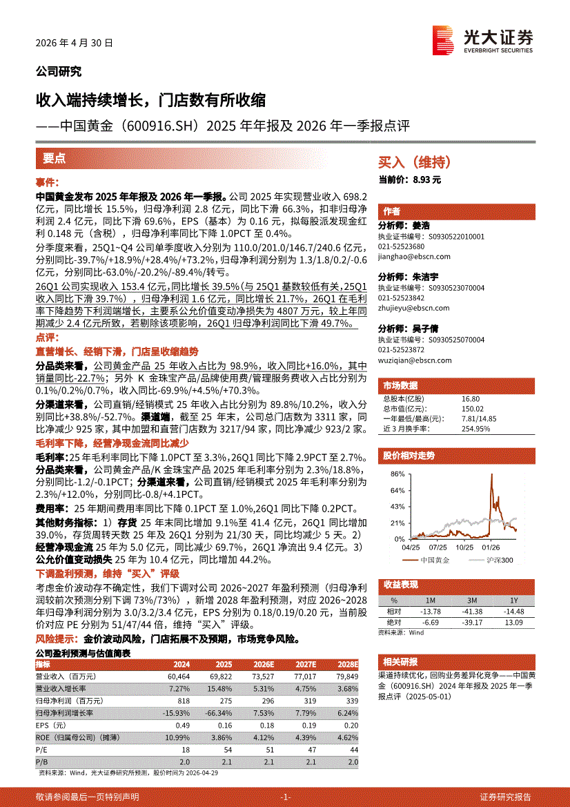 中国黄金:光大证券-中国黄金-600916-2025年年报及2026年一季报点评:收入端持续增长,门店数有所收缩-260430