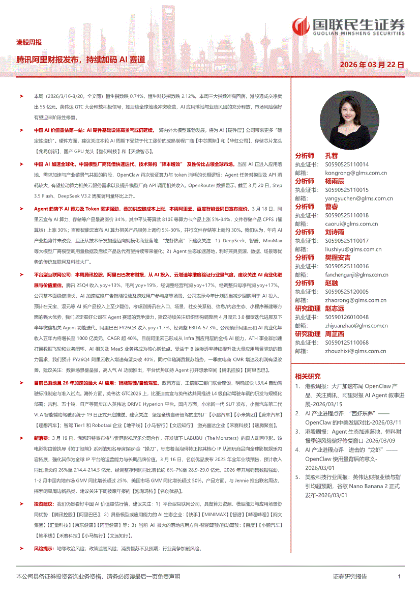 国联民生证券-港股周报:腾讯阿里财报发布,持续加码AI赛道-260322