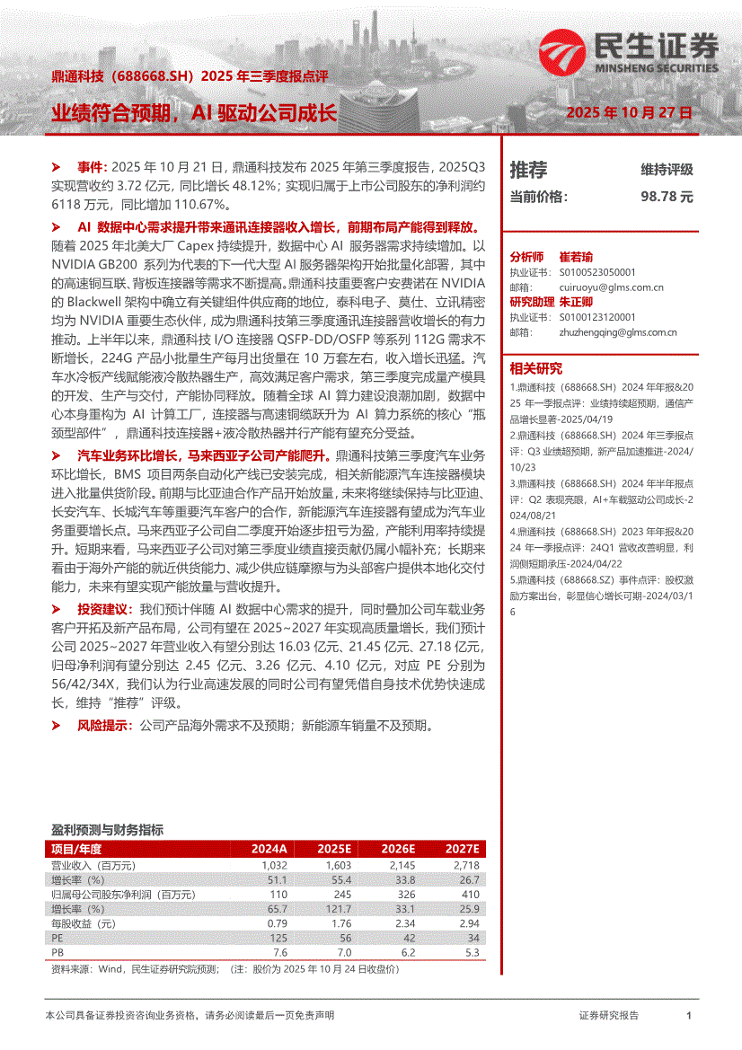 鼎通科技:民生证券-鼎通科技-688668-2025年三季度报点评:业绩符合预期,AI驱动公司成长-251027