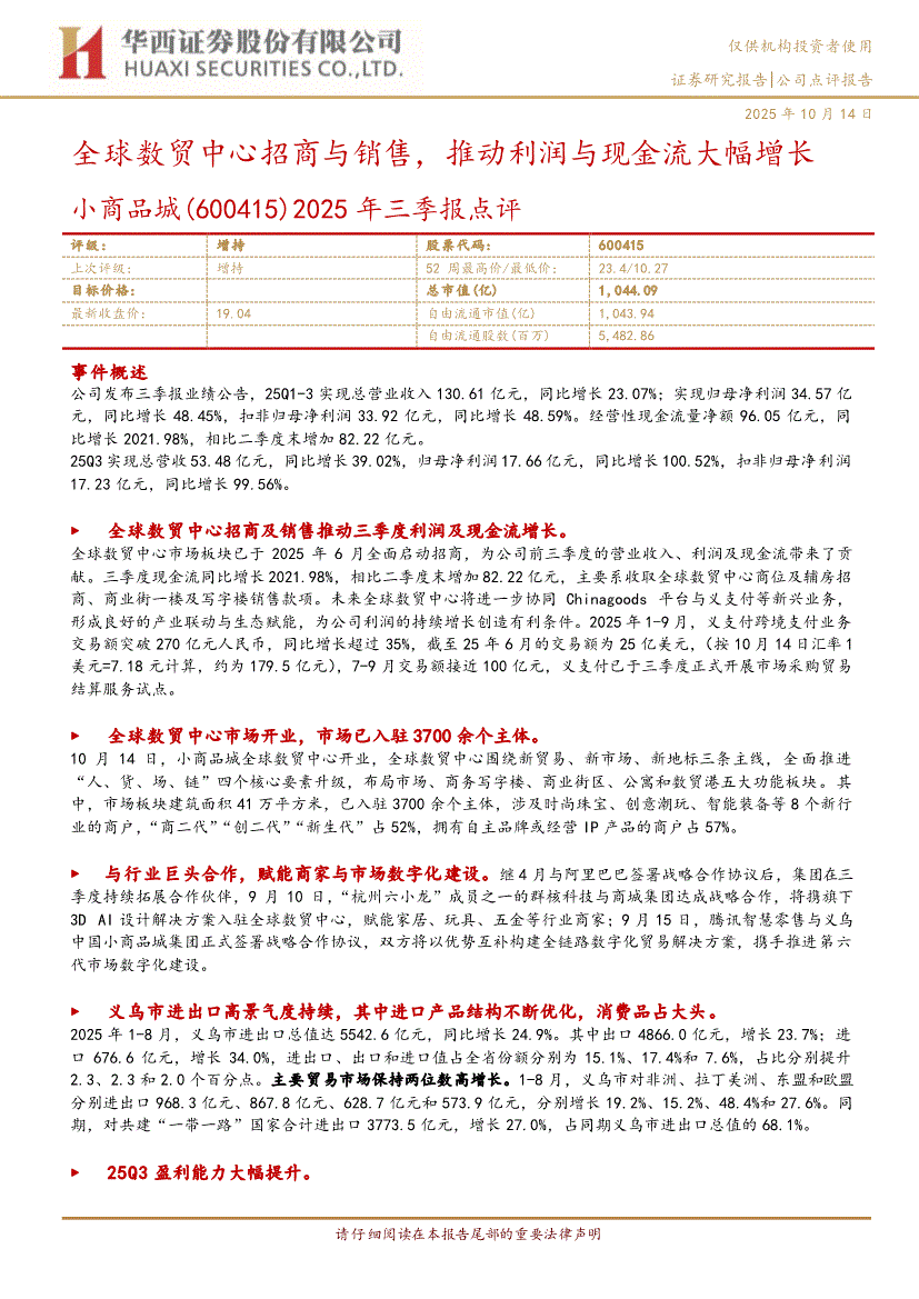 小商品城:华西证券-小商品城-600415-2025年三季报点评:全球数贸中心招商与销售,推动利润与现金流大幅增长-251014
