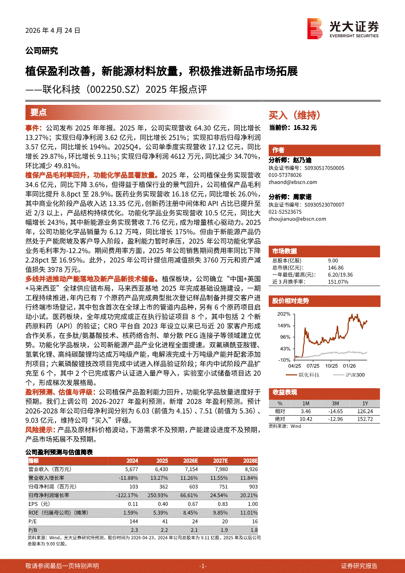 联化科技:光大证券-联化科技-002250-2025年报点评:植保盈利改善,新能源材料放量,积极推进新品市场拓展-260424