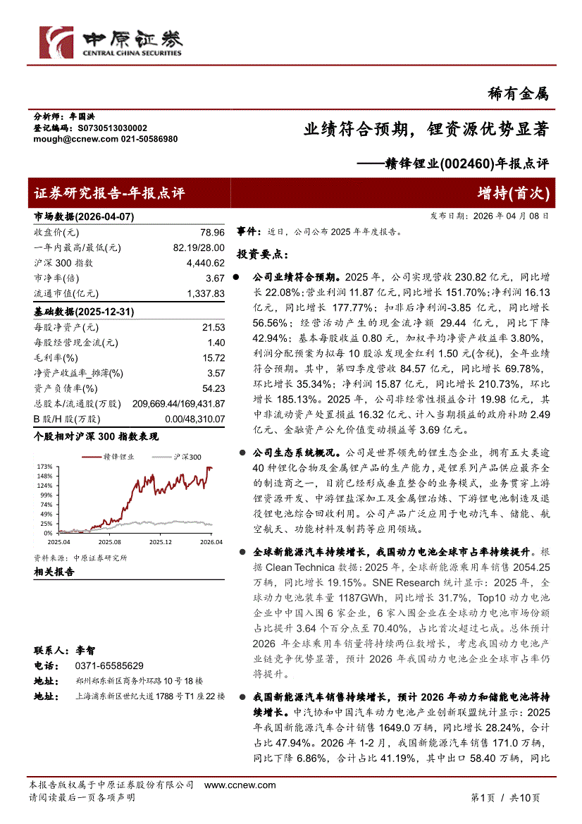 赣锋锂业:中原证券-赣锋锂业-002460-年报点评:业绩符合预期,锂资源优势显著-260408