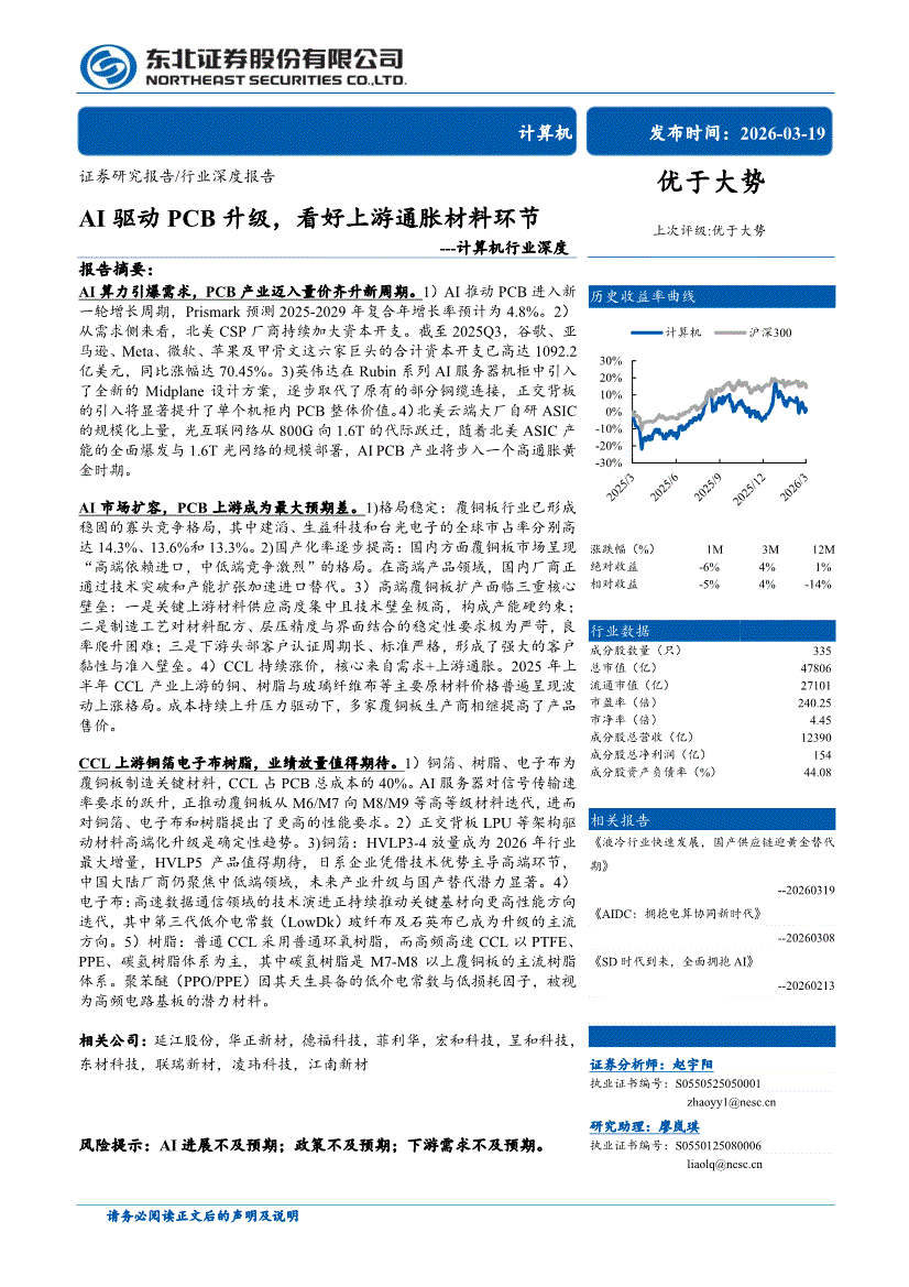 计算机行业:东北证券-计算机行业深度:AI驱动PCB升级,看好上游通胀材料环节-260319