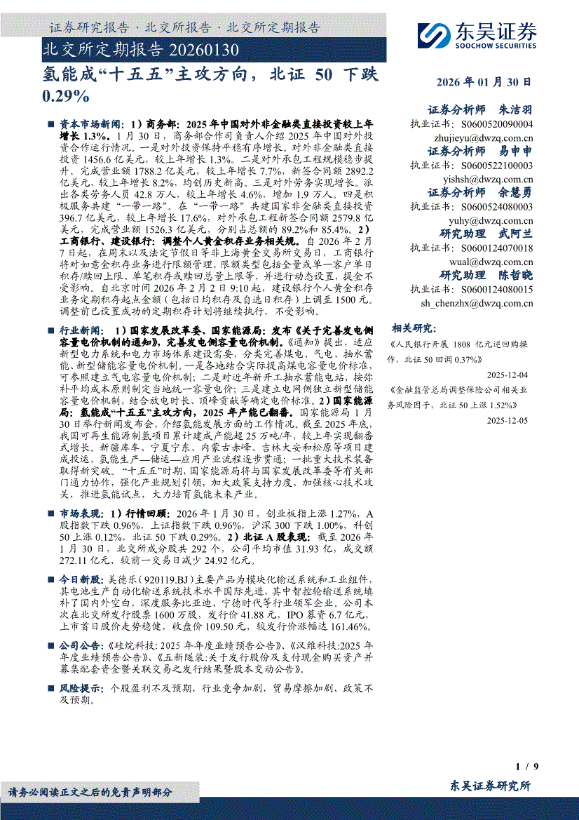 东吴证券-北交所定期报告:氢能成“十五五”主攻方向,北证50下跌0.29%-260130