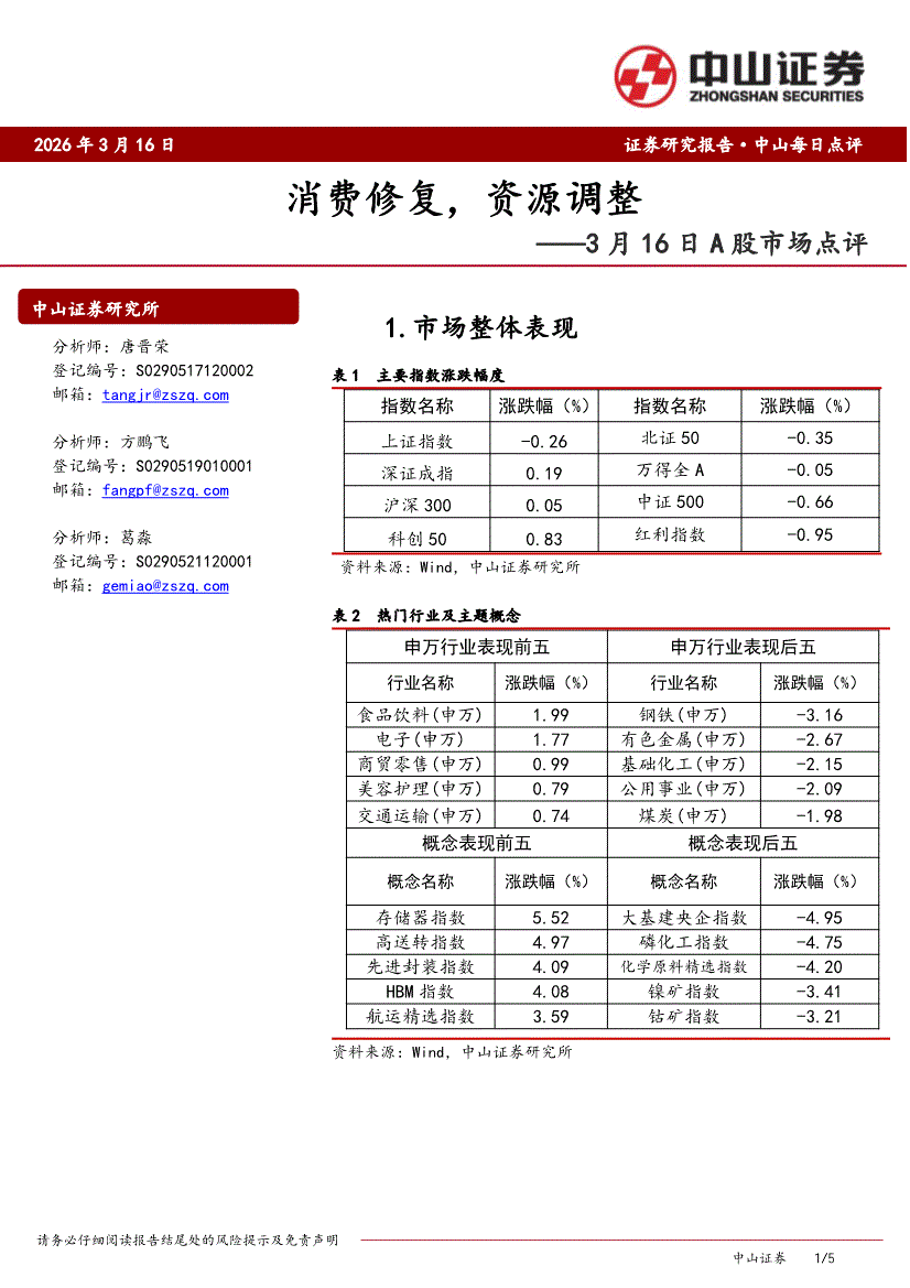 中山证券-3月16日A股市场点评:消费修复,资源调整-260316