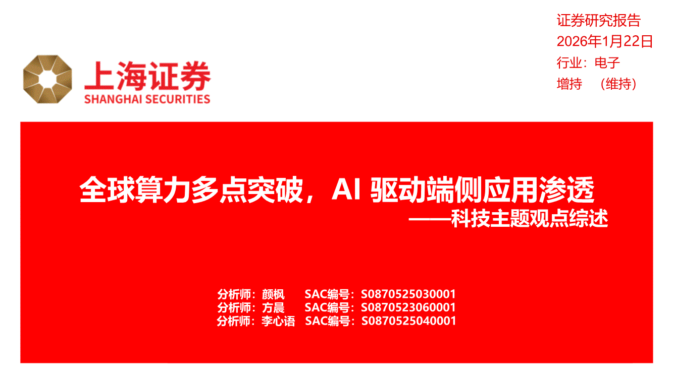 电子行业:上海证券-电子行业科技主题观点综述:全球算力多点突破,AI驱动端侧应用渗透-260122