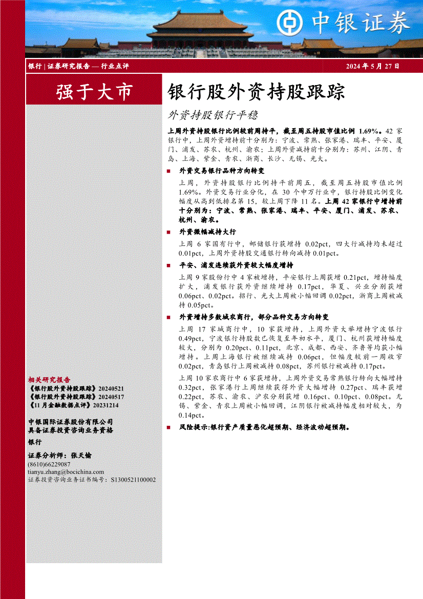 银行业:中银国际-银行业银行股外资持股跟踪:外资持股银行平稳-240527