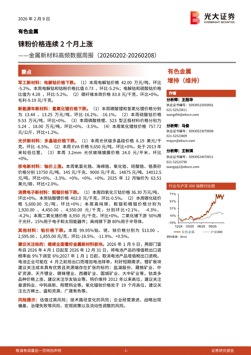 有色金属行业:光大证券-有色金属行业金属新材料高频数据周报:铼粉价格连续2个月上涨-260209
