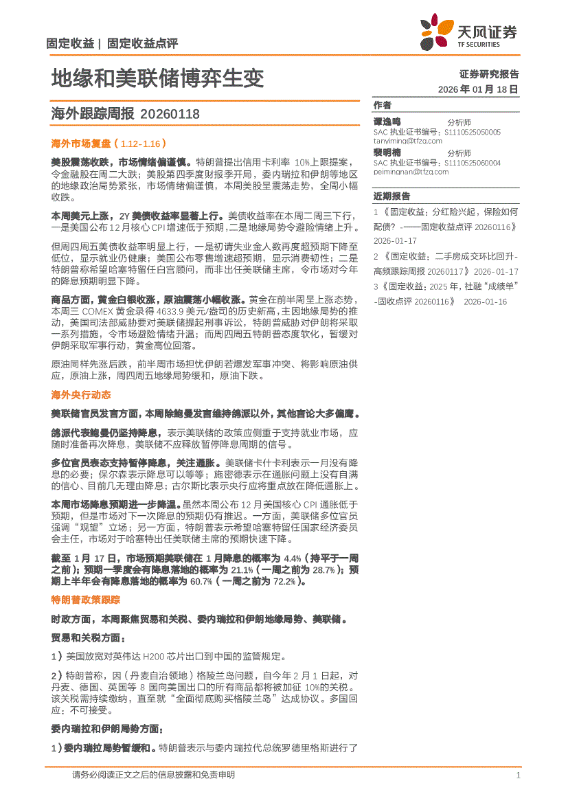 天风证券-海外跟踪周报:地缘和美联储博弈生变-260118