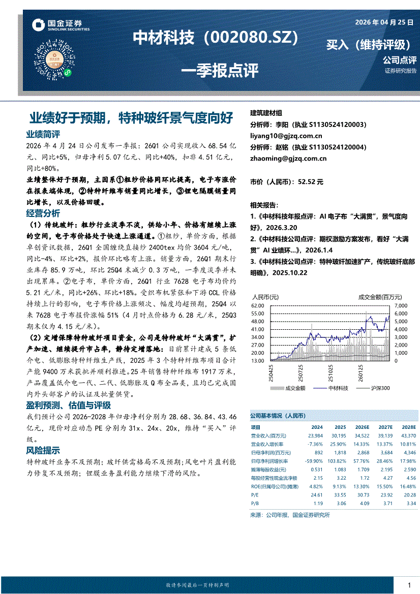 国金证券-中材科技-002080-一季报点评:业绩好于预期,特种玻纤景气度向好-260425