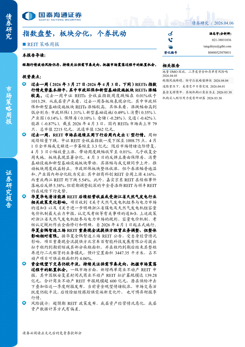 国泰海通证券-REIT策略周报:指数盘整,板块分化,个券扰动-260406