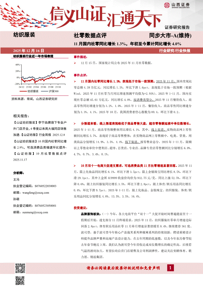 纺织服装行业:山西证券-纺织服装行业社零数据点评:11月国内社零同比增长1.3%,年初至今累计同比增长4.0%-251216