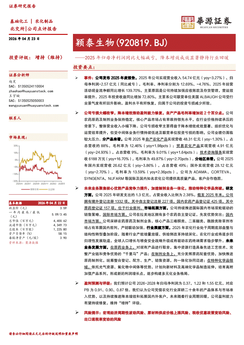 颖泰生物:华源证券-颖泰生物-920819-2025年归母净利润同比大幅减亏,降本增效成效显著静待行业回暖-260423