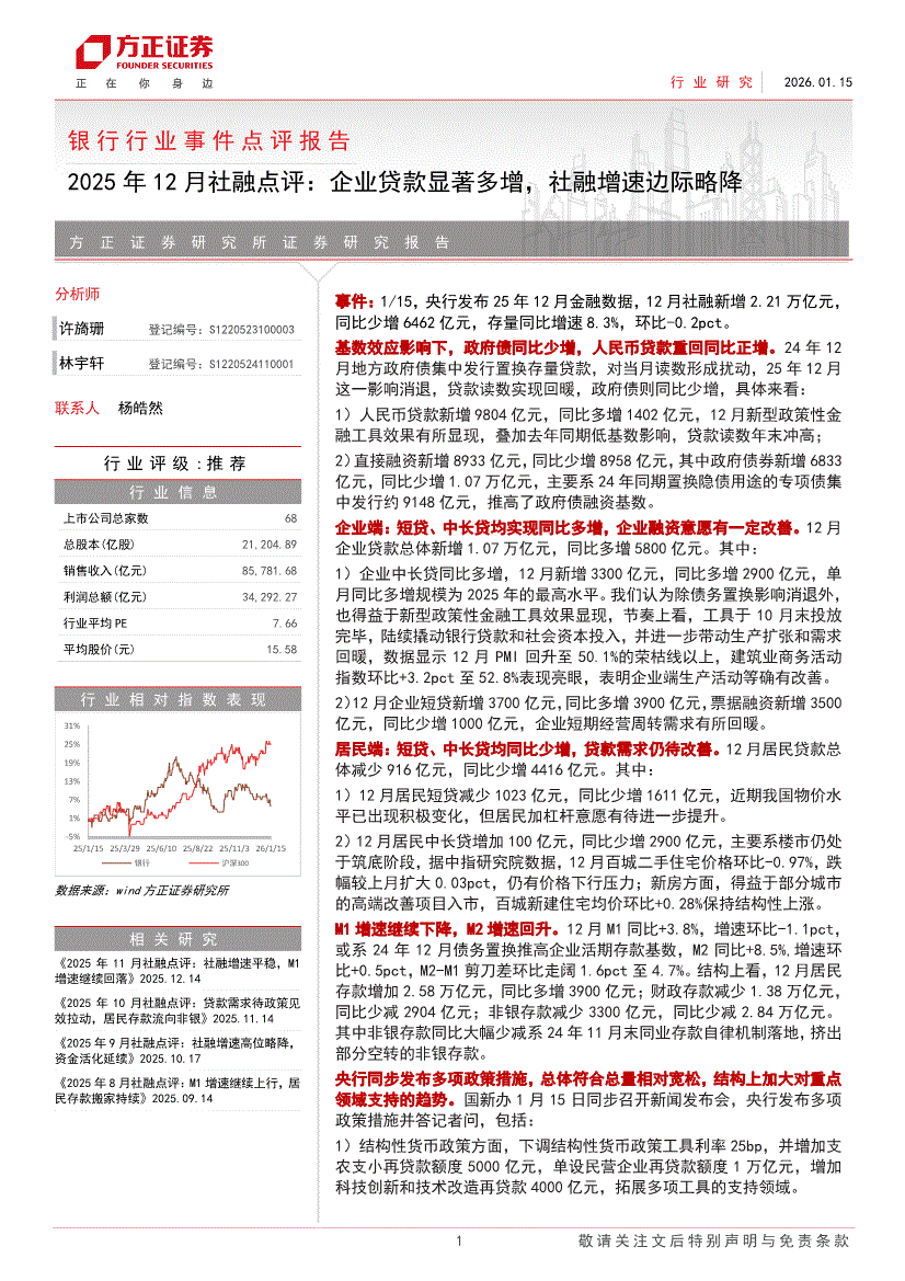 银行业:方正证券-银行行业事件点评报告:2025年12月社融点评,企业贷款显著多增,社融增速边际略降-260115