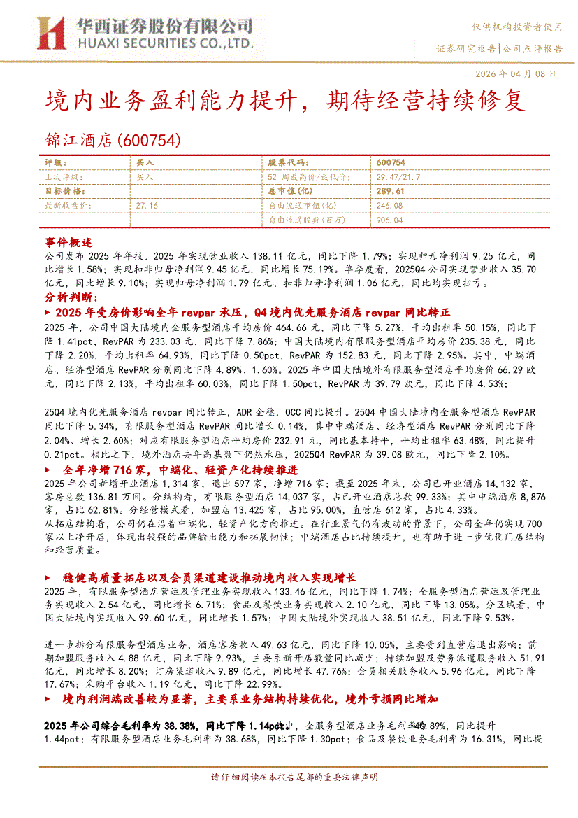 锦江酒店:华西证券-锦江酒店-600754-境内业务盈利能力提升,期待经营持续修复-260408