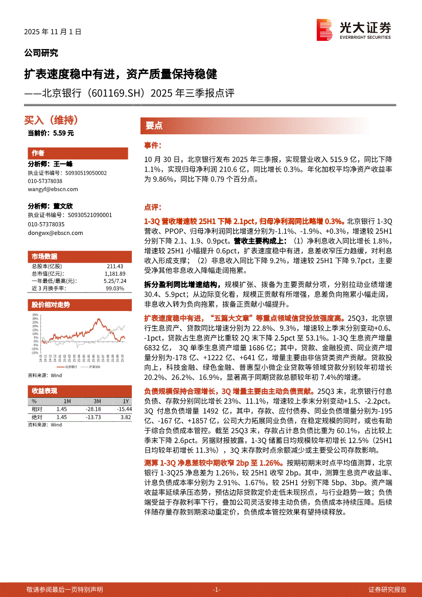 北京银行:光大证券-北京银行-601169-2025年三季报点评:扩表速度稳中有进,资产质量保持稳健-251101