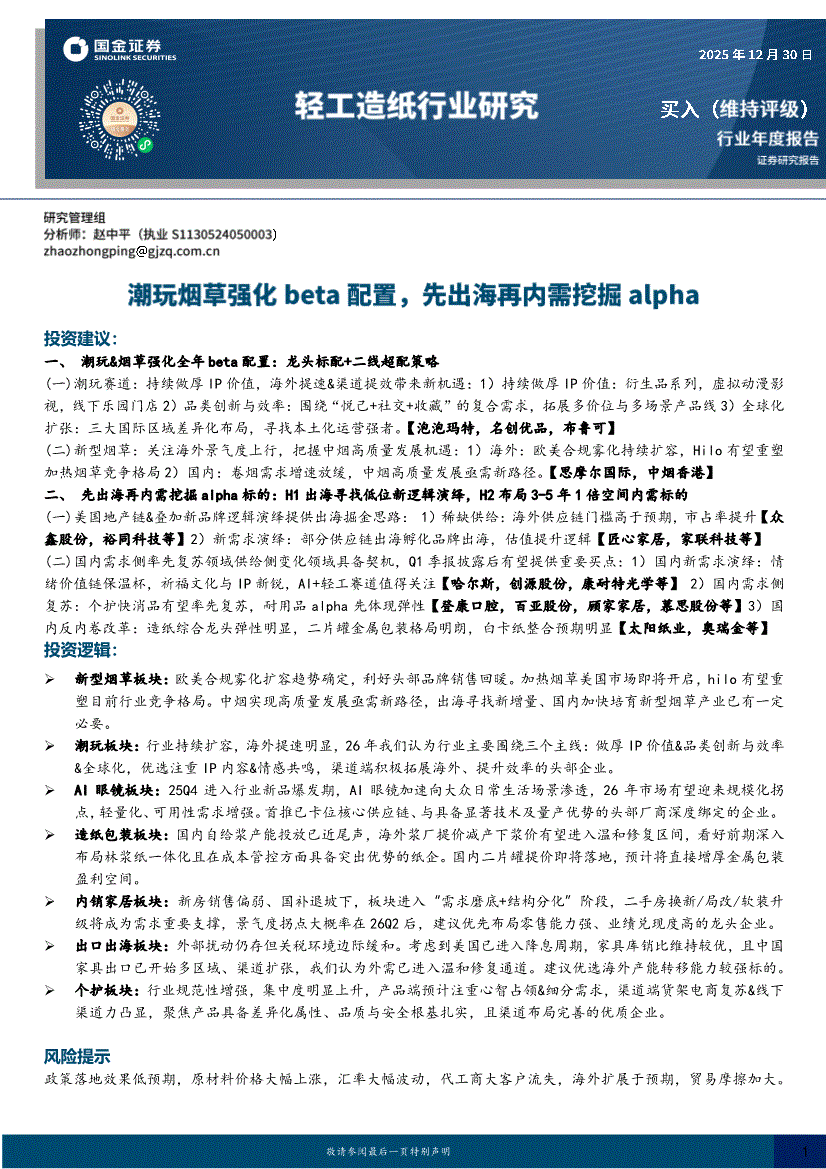 轻工造纸行业:国金证券-轻工造纸行业研究:潮玩烟草强化beta配置,先出海再内需挖掘alpha-251230