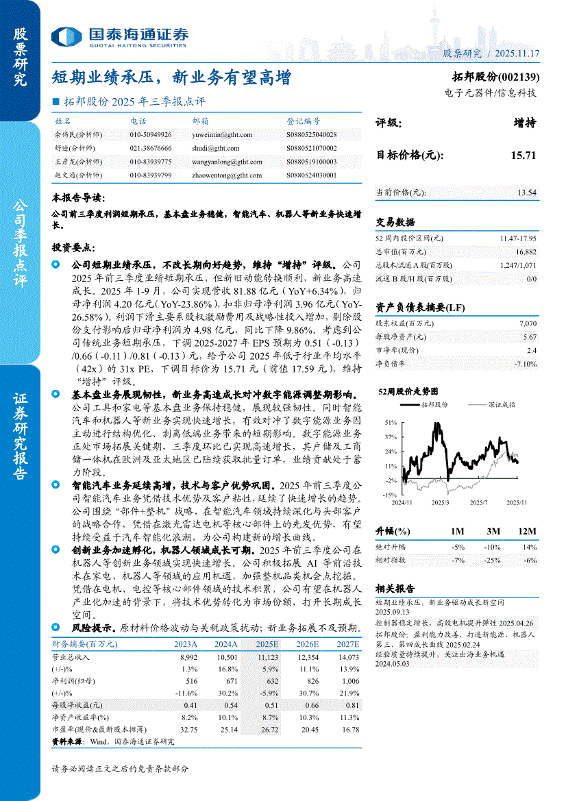 拓邦股份:国泰海通证券-拓邦股份-002139-2025年三季报点评:短期业绩承压,新业务有望高增-251117