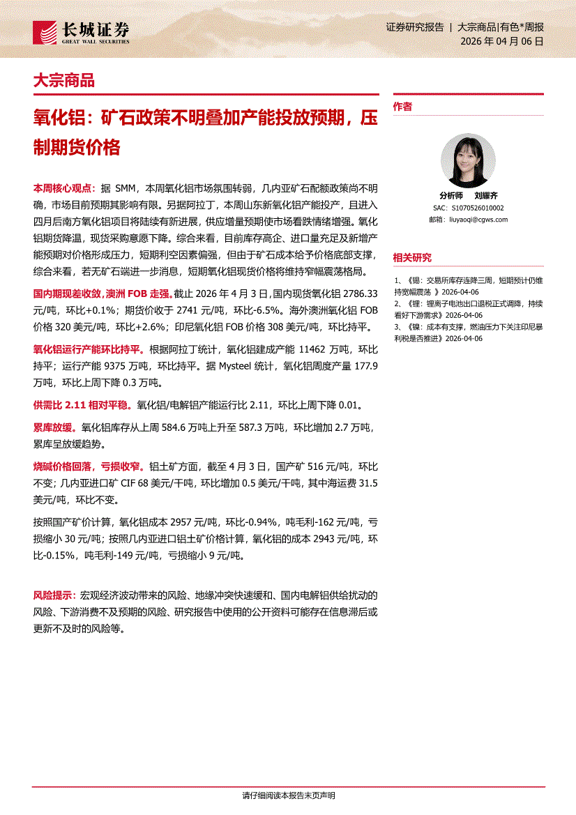 长城证券-大宗商品有色*周报:氧化铝,矿石政策不明叠加产能投放预期,压制期货价格-260406