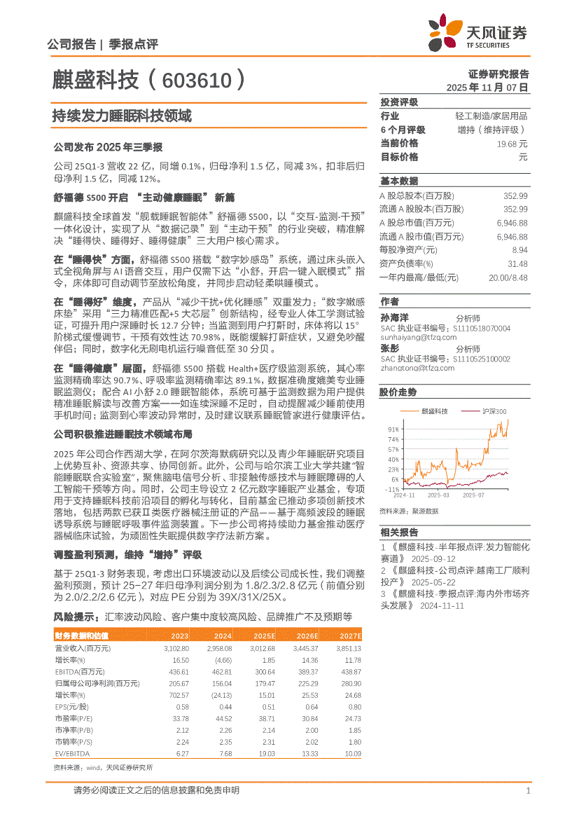 麒盛科技:天风证券-麒盛科技-603610-持续发力睡眠科技领域-251107