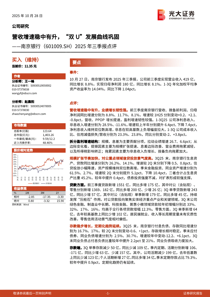 南京银行:光大证券-南京银行-601009-2025年三季报点评:营收增速稳中有升,“双U”发展曲线巩固-251028