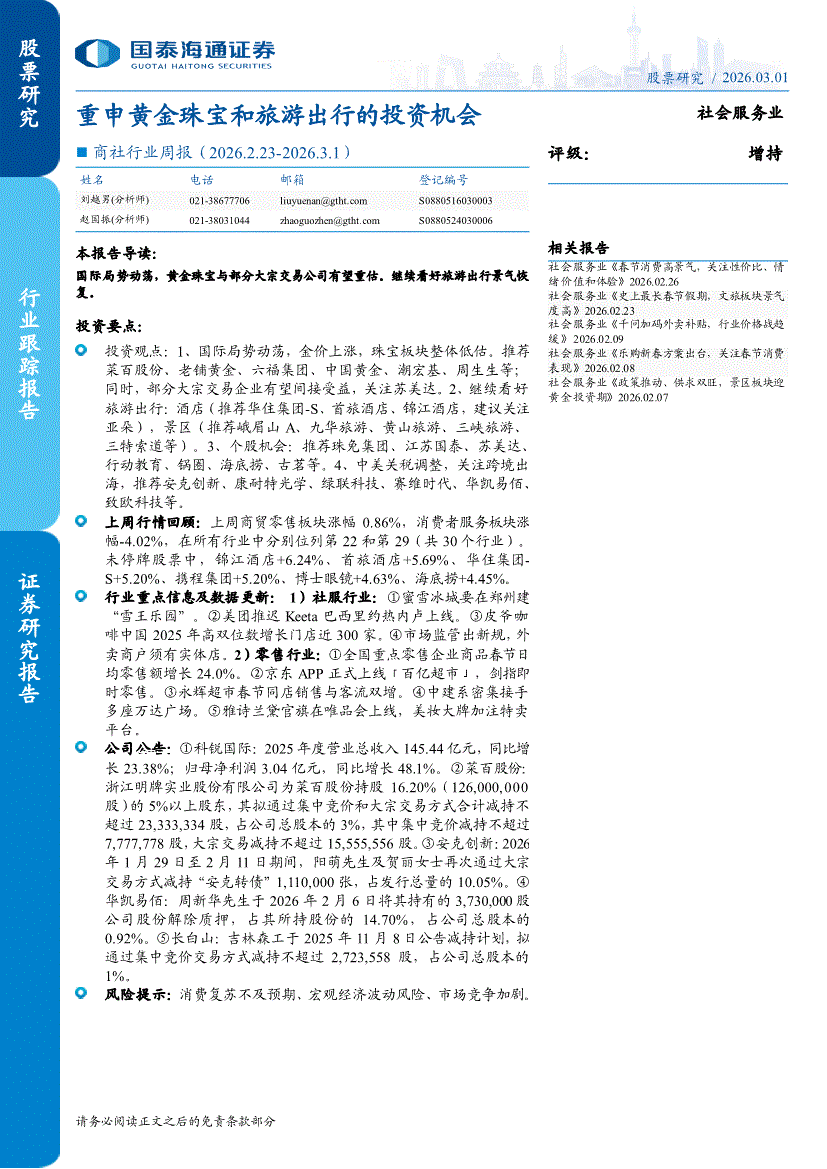 社会服务行业:国泰海通证券-商社行业周报:重申黄金珠宝和旅游出行的投资机会-260301