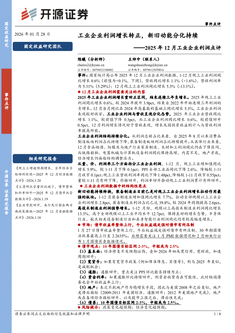 开源证券-2025年12月工业企业利润点评:工业企业利润增长转正,新旧动能分化持续-260128