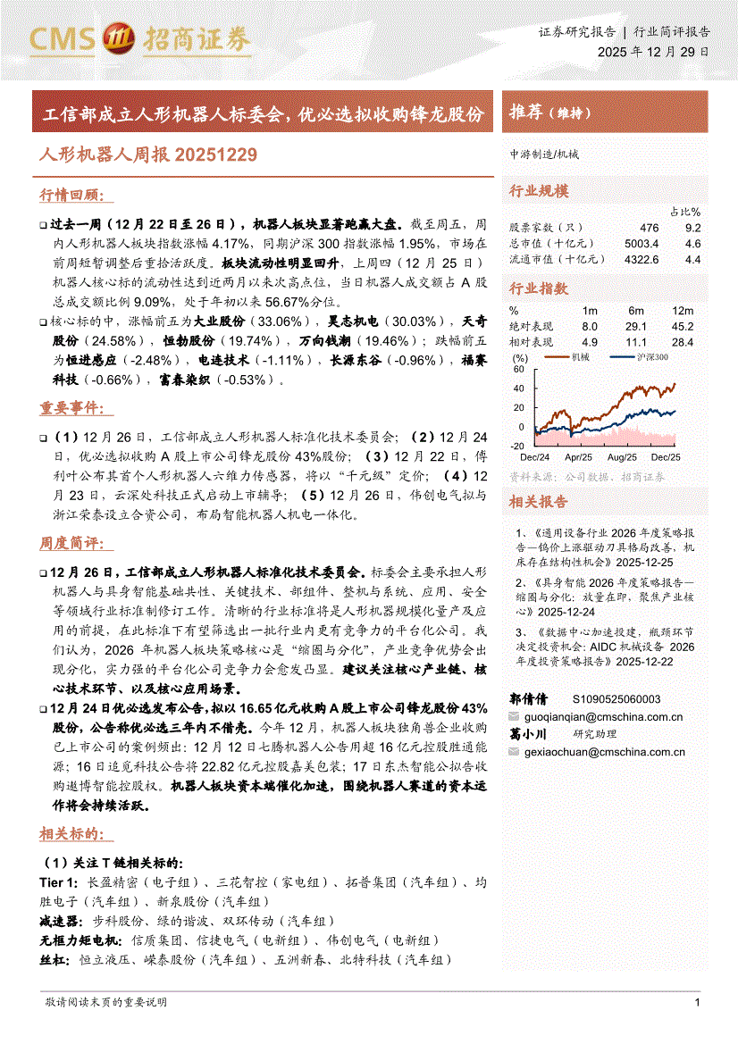 人形机器人行业:招商证券-人形机器人行业周报:工信部成立人形机器人标委会,优必选拟收购锋龙股份-251229