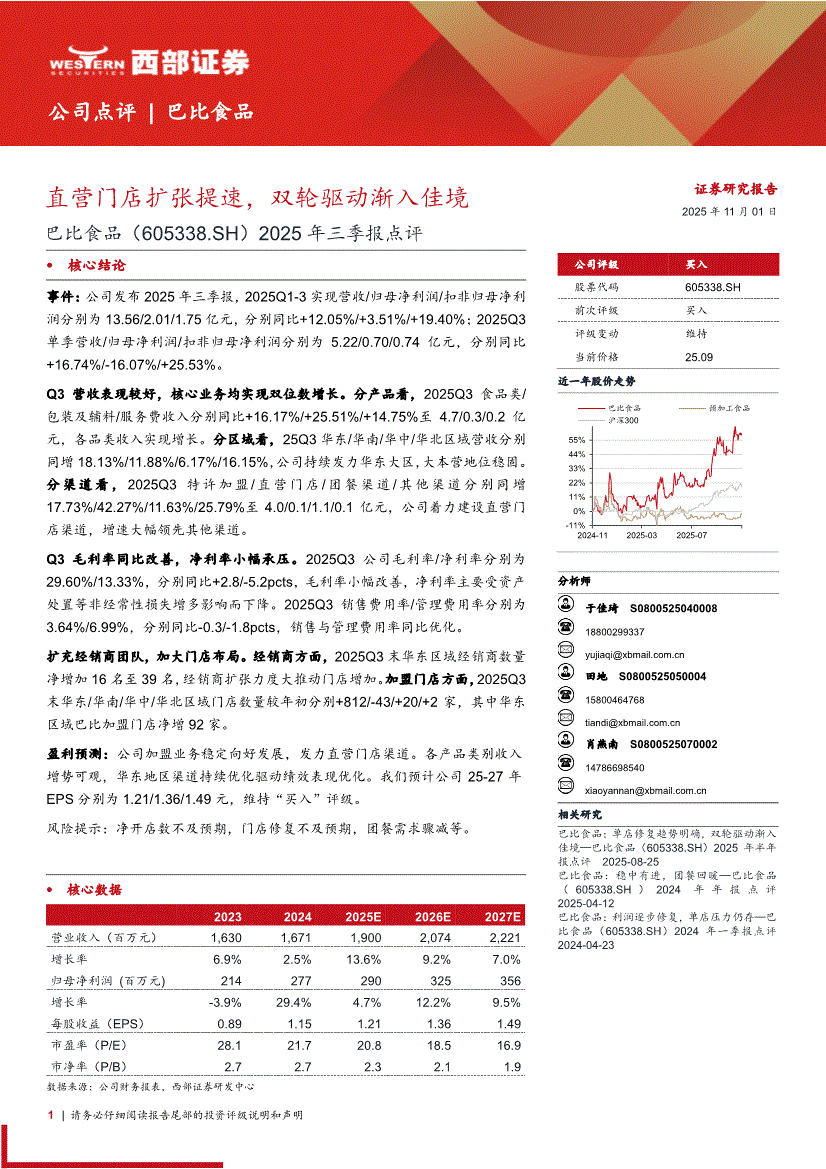 巴比食品:西部证券-巴比食品-605338-2025年三季报点评:直营门店扩张提速,双轮驱动渐入佳境-251101