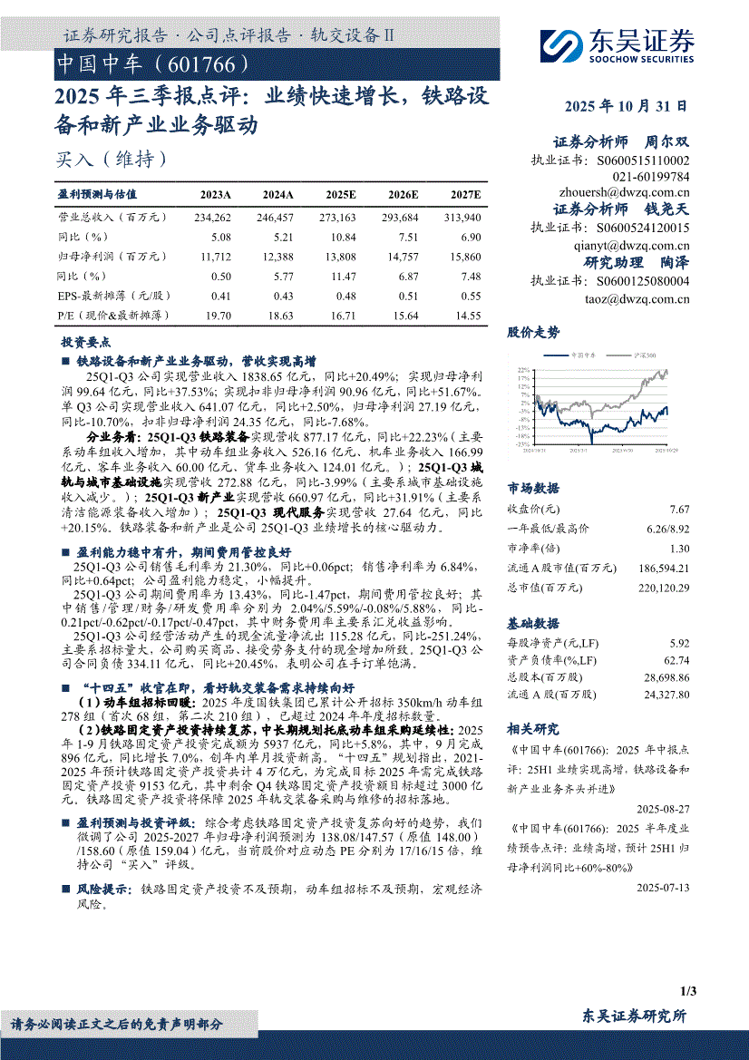 中国中车:东吴证券-中国中车-601766-2025年三季报点评:业绩快速增长,铁路设备和新产业业务驱动-251031