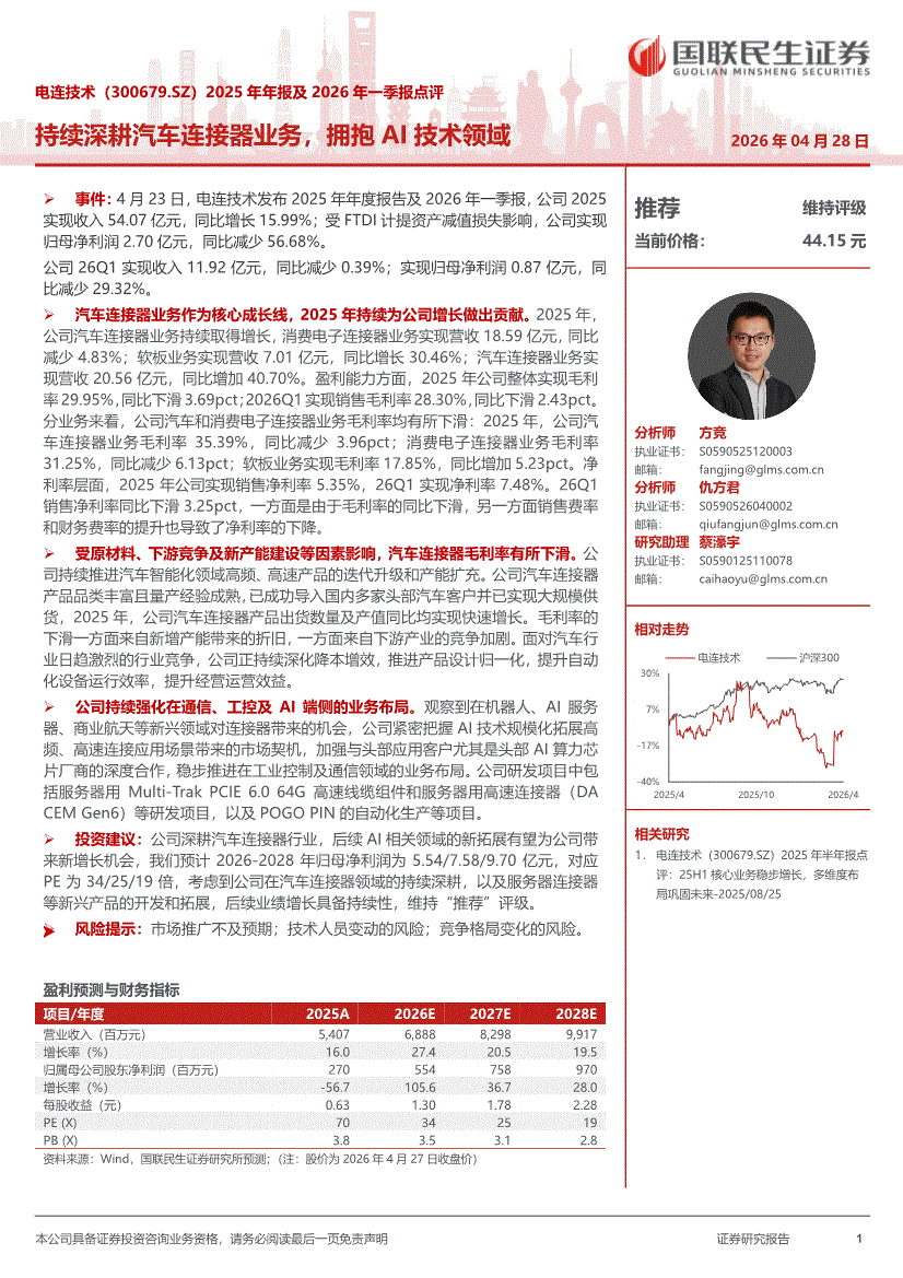电连技术:国联民生证券-电连技术-300679-2025年年报及2026年一季报点评:持续深耕汽车连接器业务,拥抱AI技术领域-260428