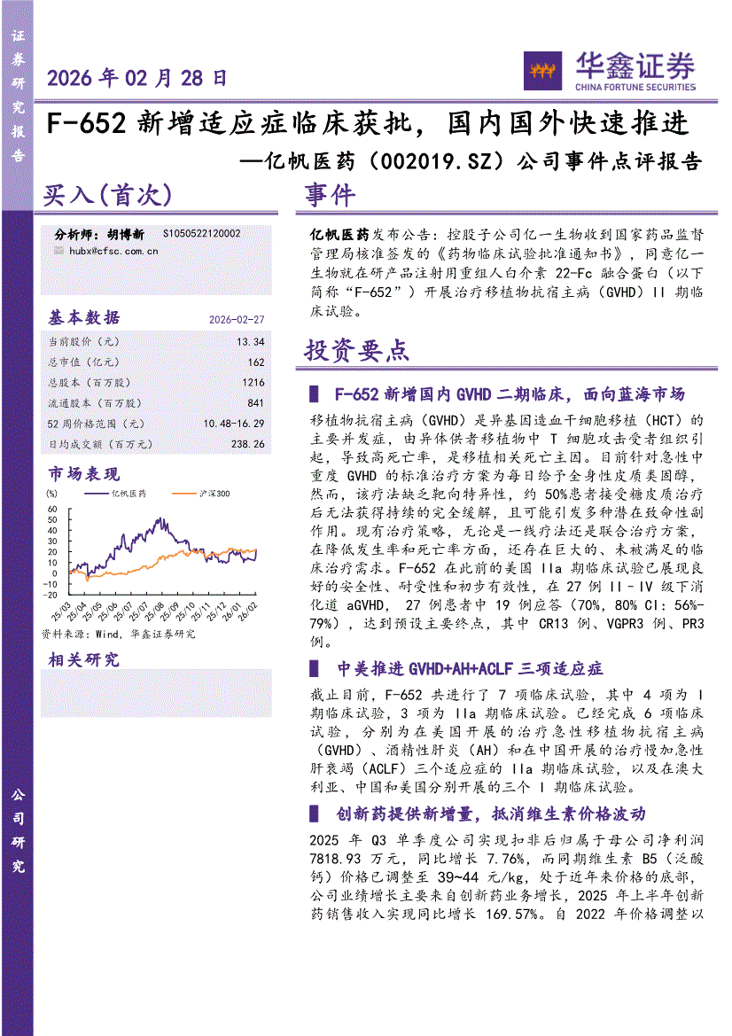 亿帆医药:华鑫证券-亿帆医药-002019-公司事件点评报告:F~652新增适应症临床获批,国内国外快速推进-260228