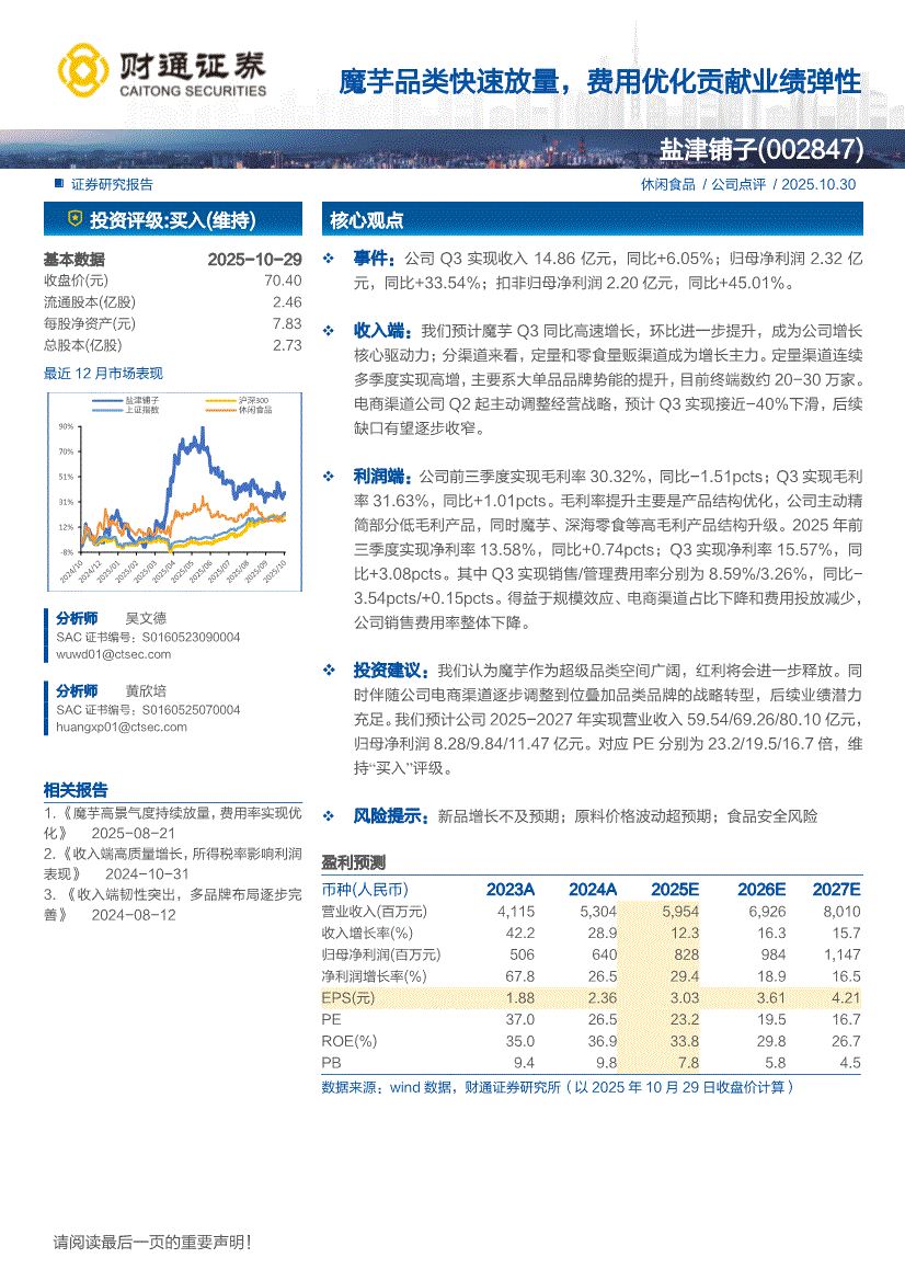 盐津铺子:财通证券-盐津铺子-002847-魔芋品类快速放量,费用优化贡献业绩弹性-251030