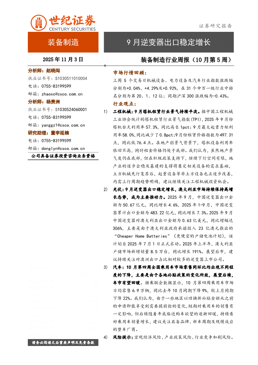 装备制造行业:世纪证券-装备制造行业周报(10月第5周):9月逆变器出口稳定增长-251103