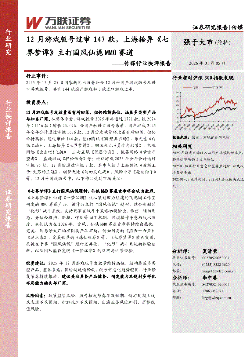 传媒行业:万联证券-传媒行业快评报告:12月游戏版号过审147款,上海拾异《七界梦谭》主打国风仙诡MMO赛道-260105