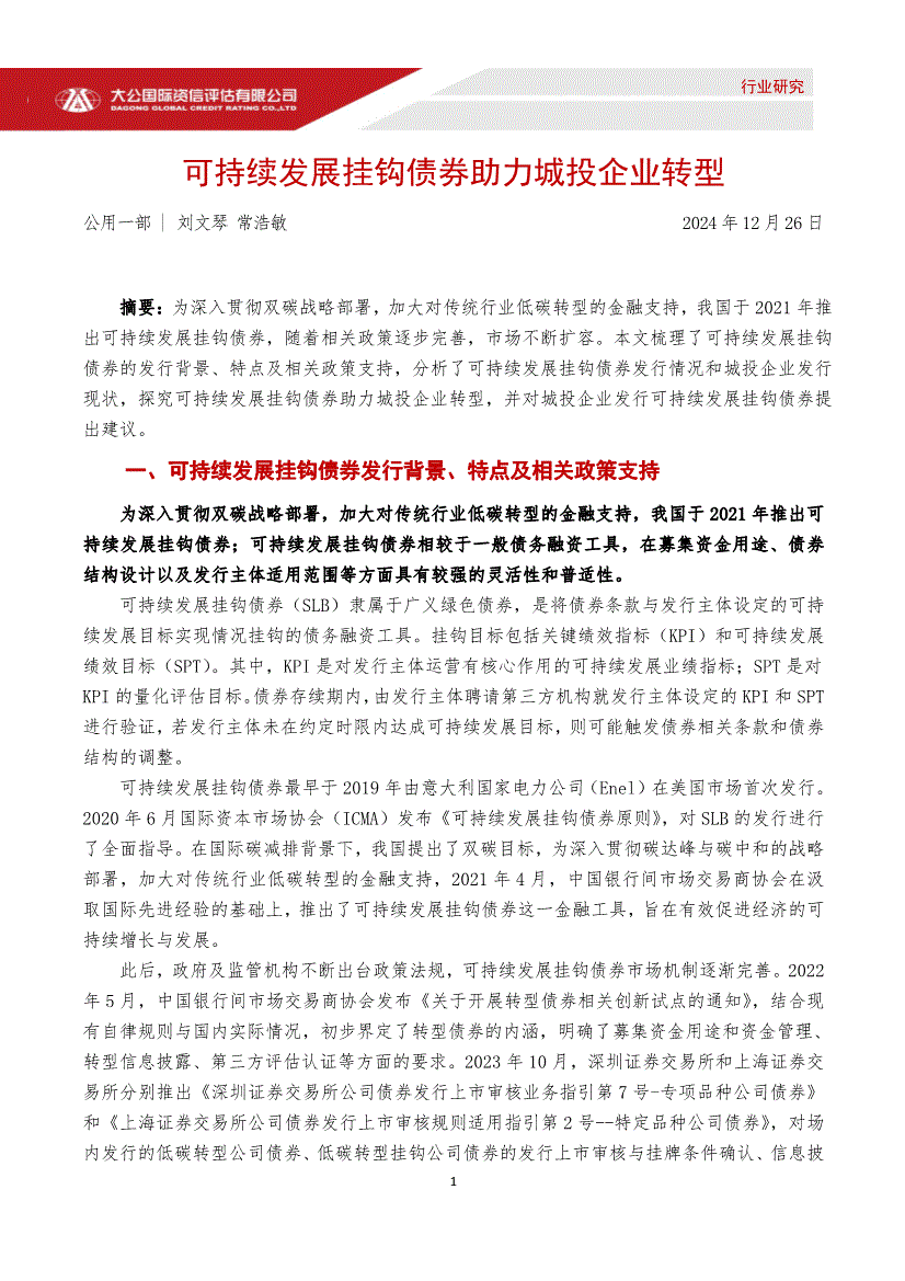 大公国际-可持续发展挂钩债券助力城投企业转型-241226