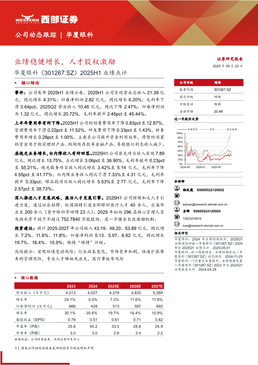 华厦眼科:西部证券-华厦眼科-301267-2025H1业绩点评:业绩稳健增长,人才股权激励-250923