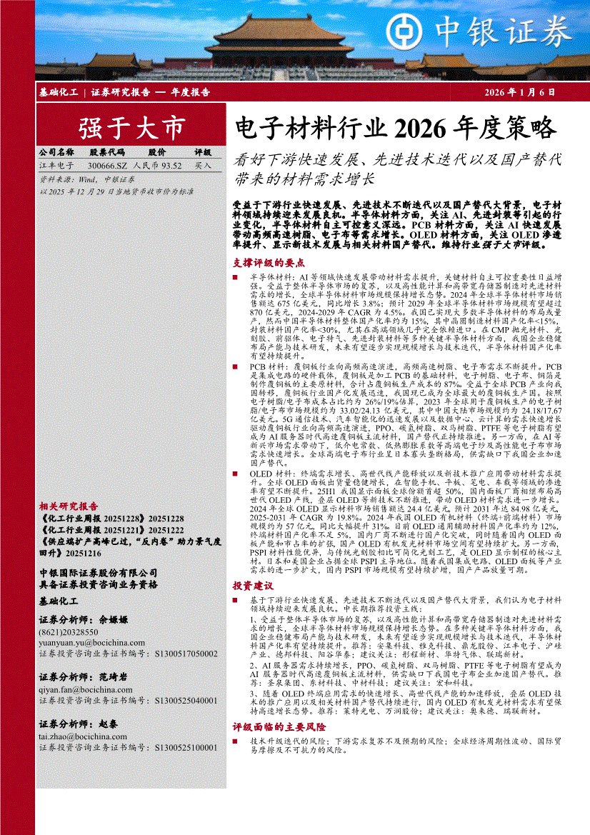 电子材料行业:中银国际-电子材料行业2026年度策略:看好下游快速发展、先进技术迭代以及国产替代带来的材料需求增长-260106