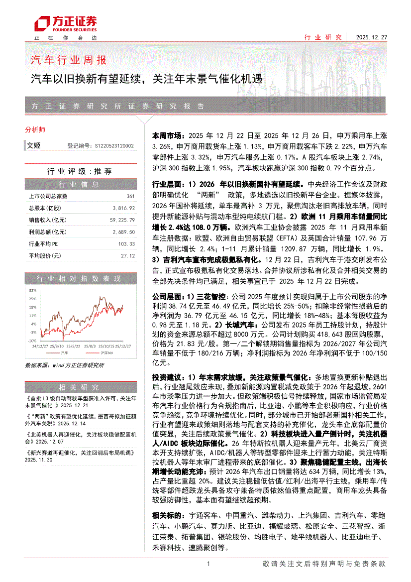 汽车行业:方正证券-汽车行业周报:汽车以旧换新有望延续,关注年末景气催化机遇-251227