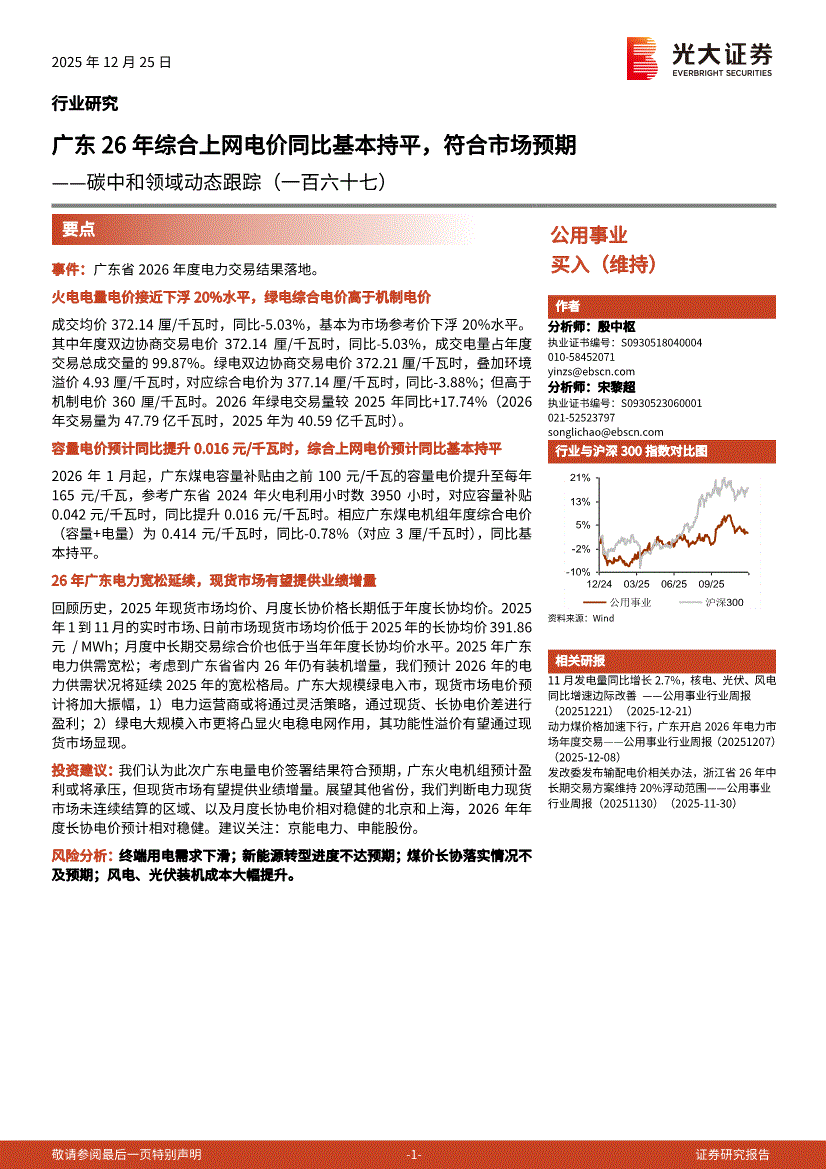 公用事业行业:光大证券-公用事业行业碳中和领域动态跟踪(一百六十七):广东26年综合上网电价同比基本持平,符合市场预期-251225